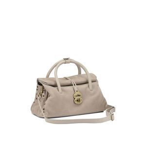 Zanellato "Dotta Jones" handbag made of suede and grained leather features a structured construction and compact silhouette. The model features rigid handles, roll-top magnet closure, tubular twist-lock buckle straps and studded details along the profiles. The interior offers a zippered pocket and lined main compartment. Adjustable and removable shoulder strap via metal hooks.