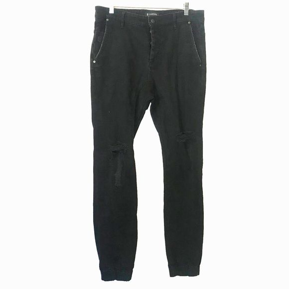 Zanerobe Slingshot Denimo Black Button Fly Distressed Denim Jogger 32