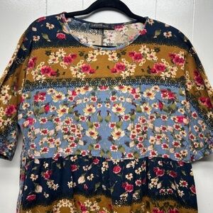 Zanzea women's pullover floral bohemian dress. Babydoll style. High waisted. Round neck. 1/2 sleeves. Unlined. Multicolor floral print. In good used condition. No stains, tears or holes.