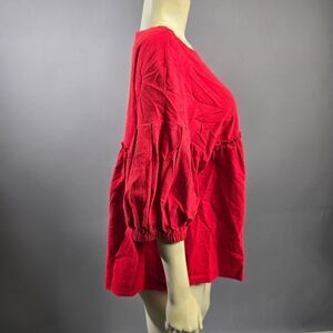 The Zanzea blouse in a vibrant red hue features elegant 3/4 puff sleeves and a relaxed, boxy silhouette. Crafted for comfort, this top offers a stylish and casual look, perfect for any laid-back occasion. Its solid color and soft fabric make it a versatile addition to your wardrobe.