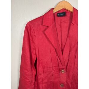 Striking red linen blazer with notched collar and pleated placket with 2 pearlescent buttons and wide long sleeves. No flaws. Measures 20” armpit to armpit, 26.5” length. Made in France