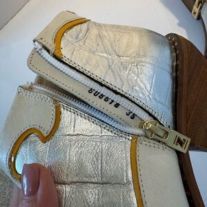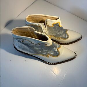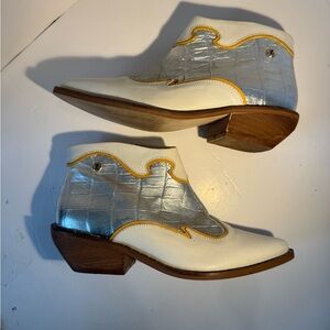 Bold and stylish Zappa ankle boots in silver croc-embossed material with cream trim and yellow piping. Western cowgirl vibes with pointed toes, wooden block heels, and studded soles. Side zippers for easy on/off.