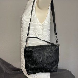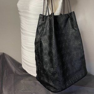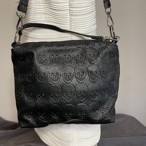 Zapps brand large bucket PU leather bag with inside pocket, embossed skulls all around, chain and leather handles, includes small accessories bag with handle.
