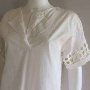 White, modern, lined Zara Basic shift mini-dress with split neck and cut-out square detail at sleeves and neck. Center seam in back and diagonal front seams from underarms to hem. Excellent condition.