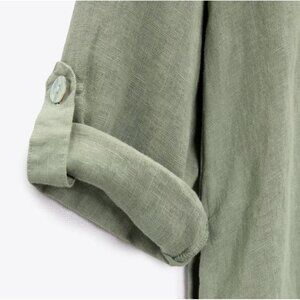 The Zara 100% Linen Shirt Dress in Khaki Green is a stylish and versatile addition to any woman's wardrobe. This long sleeve dress features a collared neckline and button front closure, making it perfect for casual or travel occasions. The solid green color and long length add a touch of sophistication, while the XS size ensures a flattering fit. Made from high-quality linen, this shirt dress from Zara offers both comfort and style for everyday wear.