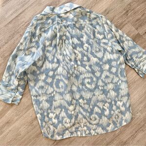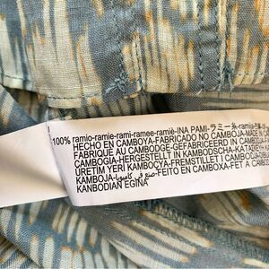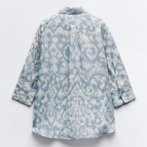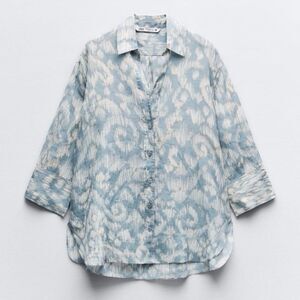 New with tags Zara women's printed shirt made of 100% ramie fabric. It features a blue and white pattern, a lapel collar, and three-quarter sleeves. The shirt has a button-down front and a pleated back. Ramie is a natural fiber known for its strength and breathability, making it a comfortable choice for clothing. It has a lightweight, linen-like feel and is plant based and eco-friendly.