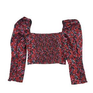 Zara -1807 Long Sleeve Floral Puff Sleeve Sweetheart Crop Top Red NWOT Small
