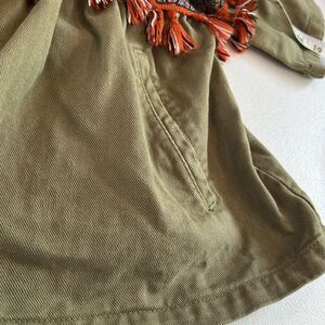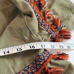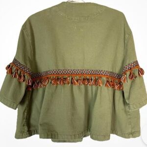 Super cute green denim jacket with hidden snaps and Boho trim