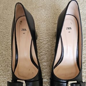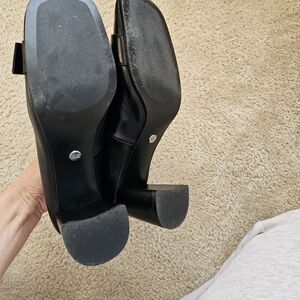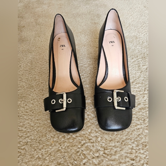 Leather block heel pumps. Front buckle detail. Square toes., Heel height: 3 inches (7.5 cm) Flexible latex technical solevery.