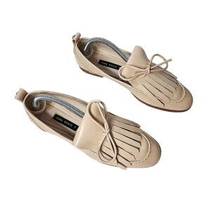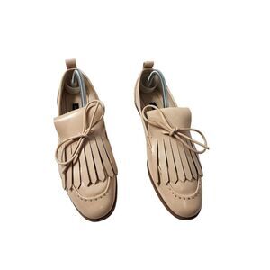 Zara faux leather loafers. Fringe details on toes. Gold mini studs around edges. Big pearl detail on heels. Bow detail on top