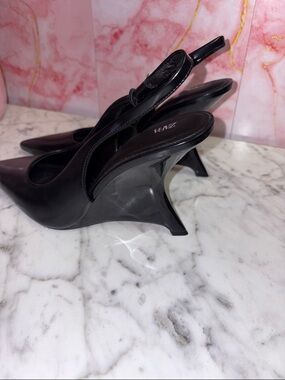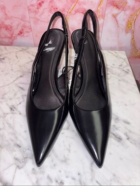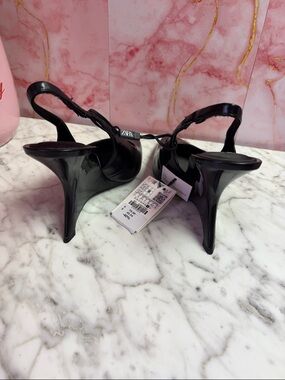 Black Patent Pointed Slingback Pumps Chic pointed-toe slingback pumps by Zara. Patent finish for a glossy look. Narrow silhouette with a sleek profile. Easy slip-on sling strap for wearability. Timeless style for dressy occasions.