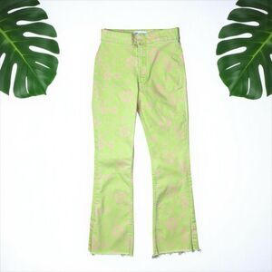 Zara 70's Retro Lime Green Mod Floral Print Flare Jeans