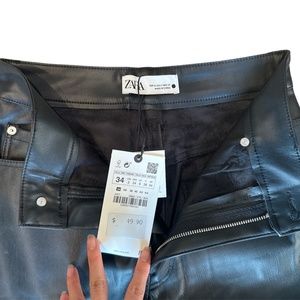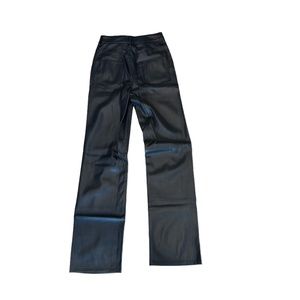 90s full length faux leather trouser. High-waisted with five pockets. Straight leg. Zip fly and metal top button fastening.