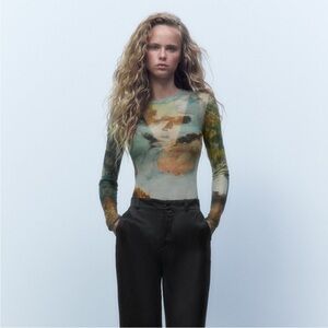 Zara long-sleeve bodysuit with artistic print. Features a blend of green, brown, and cream colors.