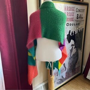 Zara Accessories wide long scarf in a vibrant teal, peach, purple, green, and pink striped pattern. Made from 100% polyester, this scarf not only boasts a striking appearance but also has a delightful fluffy look and feel.