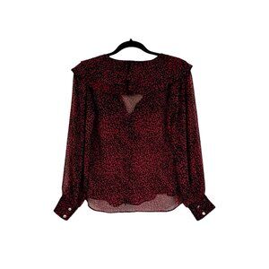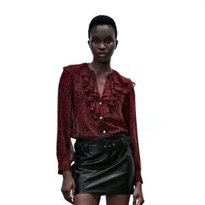 Zara Black Red Animal Print Metallic Silver Thread Detail V-Neck Double Ruffle Neckline Silver-Tone Button Up Long Blouson Sleeve Double Button Cuffs Shirttail Hem Semi Sheer Blouse Top Size Small - Excellent condition.