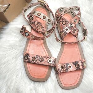 Zara flat sandals, wrap around ankle strap, coral (red orange) snake pattern leather with metal grommets, EU 41 / US 10, preowned and shows wear on the soles, footbed, exterior - see photos for details