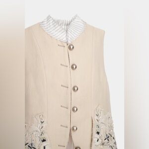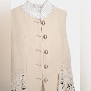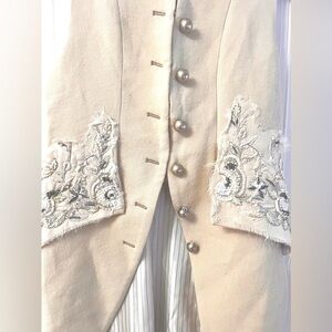 This garment is reminiscent of 18th century French tailored menswear, with an aristocratic look. A cream sleeveless vest with tailcoat, high collar, striped pattern lining. floral embroidery detail on the tonal flaps on deconstructed delicate organza patches. Side hidden in-seam pockets. Collar features the same striped pattern as the inside of the jacket. Front metal button detail with hook & eye closures. Back slit at hem. Limited number of pieces were made. Sold out everywhere. Truly a work of art.