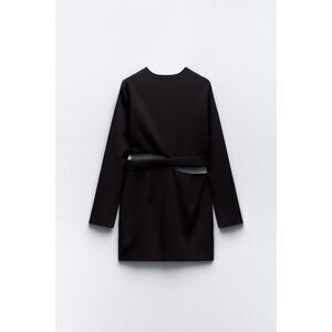 Mini dress with round neck and long sleeves. Opening detail at waist and belt with metal buckle. Side hidden in-seam zip closure.