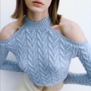 Zara Baby Blue Cable Knit Cold Shoulder Cut Out Mock Neck Sweater NWT