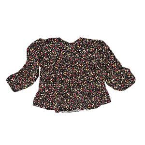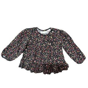 This Zara Baby Collection Peasant Blouse in size 2-3Y features a black long sleeve blouse with all over multicolor ditsy floral print. Cuffs are elasticized with a small peplum / ruffle hem and the cutest asymmetrical three-button closure on front of neckline.
