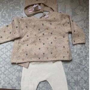 The most darling Zara baby knit outfit, perfect for fall or winter family photos. Our baby only wore this once or twice (for photos), so it's in excellent used condition. Sweater and tights are 3-6 month size, while the bonnet is 1-6 months. Excellent used condition.