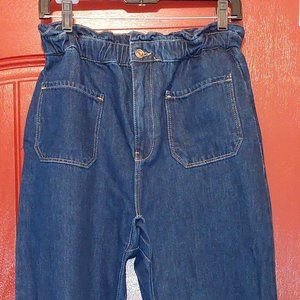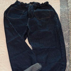 Dark blue indigo jeans that are gathered at the waist and relaxed at the hips. The jeans can be worn straight but are cool rolled up with a pair of Doc Martens and a funky jean jacket or sweater.