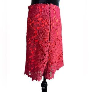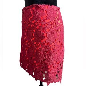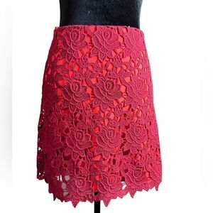 This is beautiful in person. Deep red in color and perfect for date night. A-line shape. Fully lined. Side zipper. No stretch. Size medium.