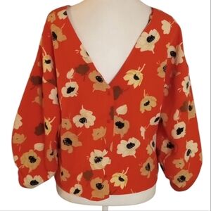 Zara Basic All Over Poppy Floral Print Back Button Balloon Sleeves Blouse Medium