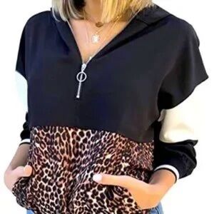 Zara Basic Black Leopard Print Color Block Lightweight Pullover Hoodie Sweatshirt with waist adjustable drawstring in Women’s XS.
