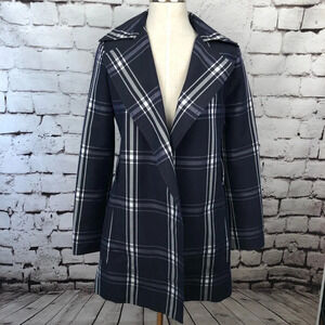 Zara Basic Collection Blue Plaid Checkered Jacket perfect for spring. Lightweight trench coat. Navy blue jacket with allover plaid check print in white. Open styling. Has loops for belt, but does not come with tie. Lined. Outer shell is 55% cotton 45% polyester. Lining is 100% acetate. Armpit to armpit is approx 17.75” and length is approx 32”