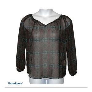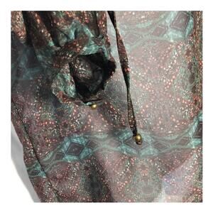 Add effortless boho chic to your look with this Zara Basic Collection Sheer Blouse in a stunning mix of dark green, blue, burgundy, pink, white, and black. This lightweight, semi-sheer top features a self-tie neckline with beaded tassel ends, button cuffs, and a loose, flowy fit that flatters every shape. Perfect for layering over a cami or bralette and pairing with denim, leather pants, or a maxi skirt for a stylish day-to-night outfit. Long sleeves and a drapey silhouette make it a versatile piece for year-round wear. Excellent pre-owned condition from a smoke-free home.