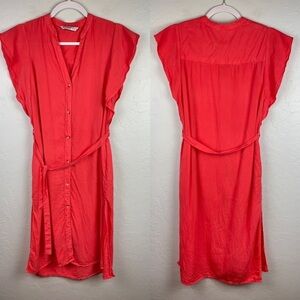 Zara Basic Button Front Shirt Dress With Frill Sleeves and Belt in Coral X-Small
