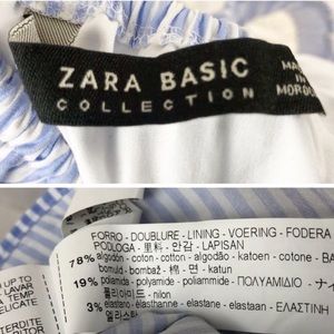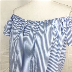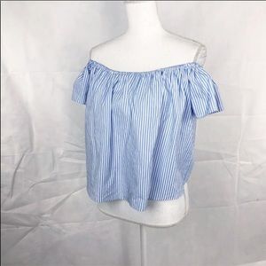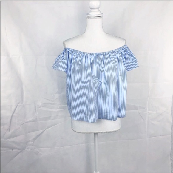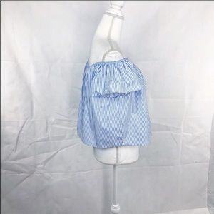 Zara Basic Collection. Medium. White and blue striped ruffle, off the shoulder crop top. Has an inside liner that is fitted under bust area. Super cute! In brand new and perfect condition!