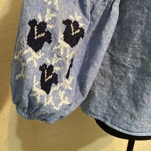 A medium size, blue shirt, embroidered black and white design around the sleeves. Puffy sleeves. A great fun shirt!