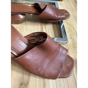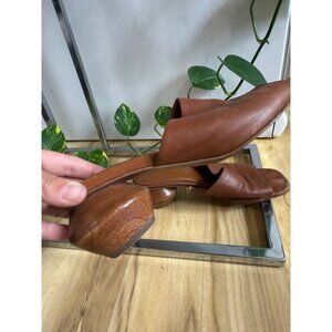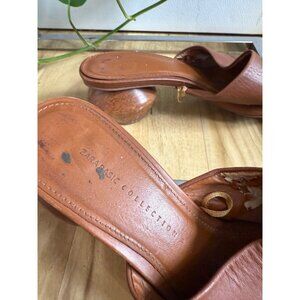 Stylish Zara Basic Collection mules in rich brown leather with chunky round wood-look heels. Size 38 (fits US 7.5). These have noticeable wear and peeling on the insides and some scuffs on the heels/soles, but still a trendy style for everyday looks or a project piece for repair.