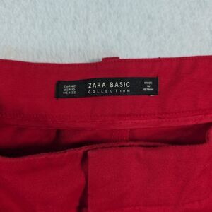 The Zara Basic Collection Chino Fit Pants in women's size 10 are a stylish and versatile addition to any wardrobe. Made from a comfortable cotton blend fabric with a twill weave, these tapered red pants feature a mid-rise waist with a zip, button, and hook & eye closure. There is a flaw on a belt loop. (pictured)