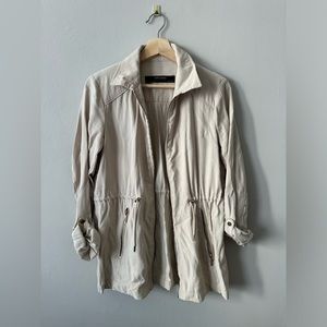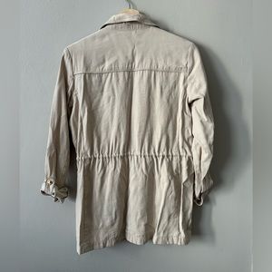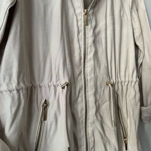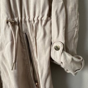 Light tan/cream, light-weight utility inspired jacket with gold-tone zipper and details, zipper pockets, drawstring cinching waist.