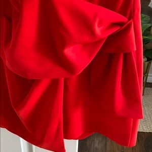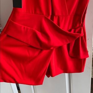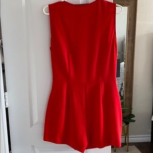 Beautiful red romper. Bottom is skort style. Pleated, tying waist sits above attached shorts hidden by a wrapping mini skirt.