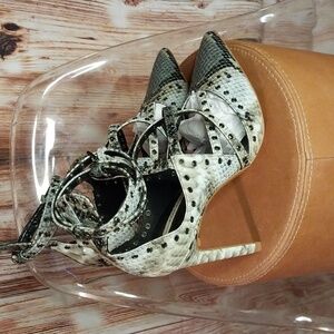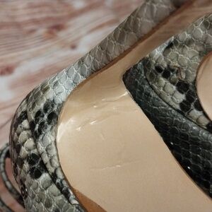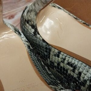 These are the strappy snakeskin heels, they are green and a touch of white in between. There are some metal ring details on the straps and top of the shoe. It is a size 36 with a 3" heel and pointed toe. I indicated a minor defects on the bottom soles with the pics. They are new without the box, never been worn.