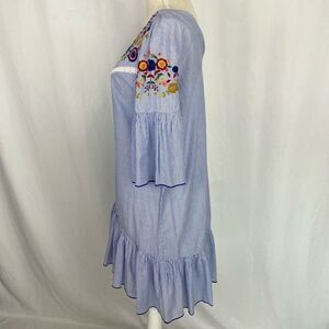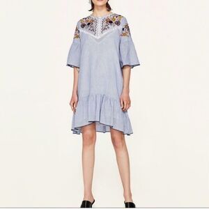 Zara Basic Collection Womens Dress Size Small Embroidered floral design on bodice, shoulder area, blue stripes, 3/4 bell sleeves, lined, ruffle bottom hem