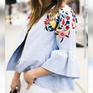 Zara Basic Collection blue & white striped seersucker zip jacket, embroidered S