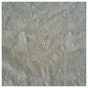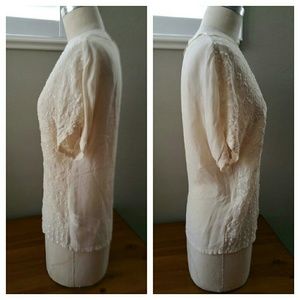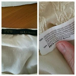 Zara Basic Cream Chiffon Embroidered Blouse in good used condition, no flaws. Very beautiful and intricate embroidered pattern print. It says xsmall, but small could consider this as well. Measurements are: Length is 23", Bust width is 20", waist width is 17" and waist width at the bottom is 18", Sleeve Length is 4".
