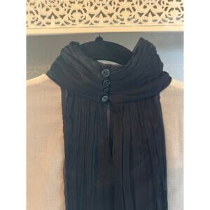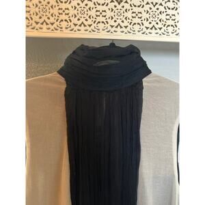 Zara Basic Cream and Black Silk Blend Blouse with black satin side tie and wide band along the bottom. Sheer ColorBlock Pattern. Chiffon Panel runs up the middle of the front and back of the blouse and connects to a high neck with 4 buttons on the back of neck.