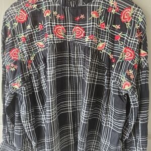 Zara Basic Denim Embroidered Floral Checked Shirt Top Size Small Women