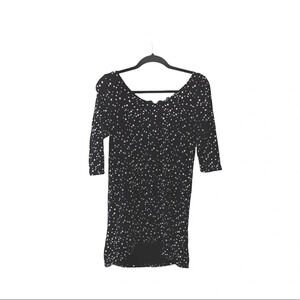 Zara Basic Evening black & white star print tunic top. In excellent condition! Wide crew neckline. 3/4 fitted sleeves. Step bottom hem. Gold zip back closure. Tunic length. Black with small white stars. Size medium.