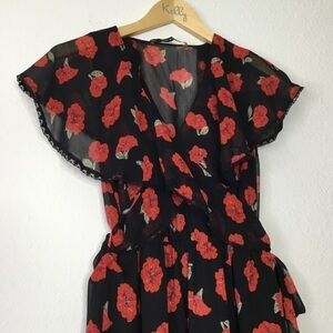 A beautiful floral dress. Black background with bright red flowers. Fun sleeve details. Wrap style with an adjustable side tie. Sheer top, black under skirt.