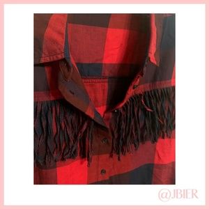 Zara Basic Fringe Flannel features button-down closure, fringe detailing, and a pointed collar. Style with our Faux Leather Pants and LF Black Booties for an elevated campus look. Excellent condition.