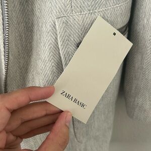Chic and versatile collarless coat. Features a sleek zipper front.