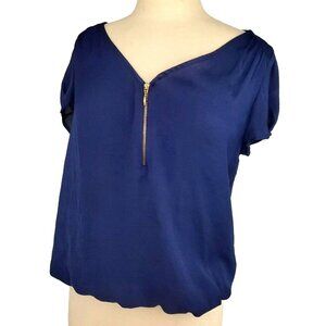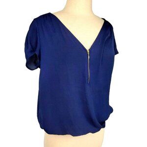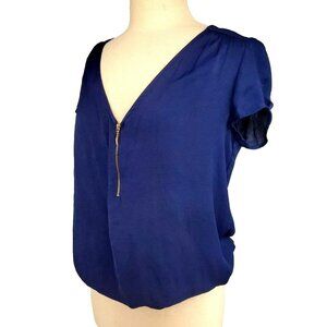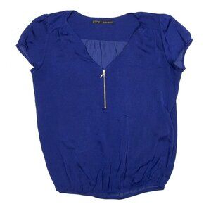 Zara Basic Med Blouse Blouson Zipper V-neck Top Cap Short Sleeve Shirt Navy Blue